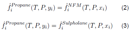 Siendo γ*2 el coeficiente de actividad para el componente líquido. Ahora bien, el coeficiente de fugacidad para el solvente sea NFM o sulfolano respecto al propano viene dado por