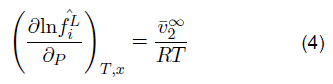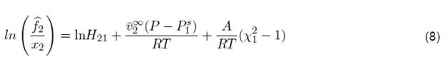 La ecuación KI consta de parámetros importantes como el volumen molar parcial infinito , constante de Henry H21 y parámetro de Margules A. Para explicar el origen de KI, entonces, se establece la fugacidad del componente liquido de acuerdo con el volumen parcial infinito de la forma