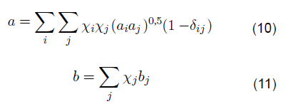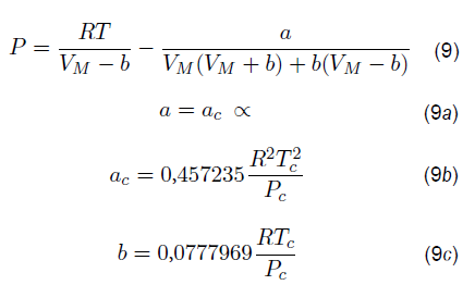 Donde P es la presión en megapascales (MPa), T es la temperatura en Kelvin (K), VMes el volumen molar en metros cúbicos por kilomol (m3/kmol), R es la constante de los gases, función alfa ∝ que es modificada para la solubilidad segun diversos autores.