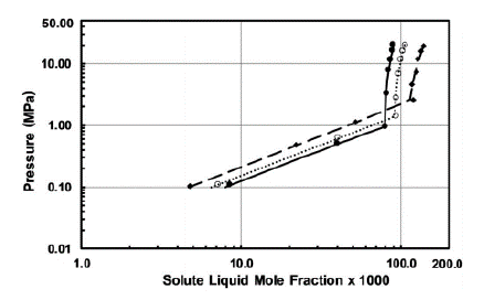 La solubilidad de un gas depende teóricamente de la presión. Es por eso que en los sistemas binarios propano (2) + sulfolano (1) y propano (2) + NFM (1) las presiones son altas, estos datos de solubilidad son evaluados por la ecuación PR. La presión de un gas es significativa debido al grado de interacción gas-disolvente; sin embargo, la constante de Henry estudia este comportamiento a ciertas temperaturas en el rango de 298,15343,15 K. A medida que aumenta la temperatura del propano disuelto en sulfolano, aumenta la constante de Henry. Este comportamiento también ocurre para NFM. El sistema de propano (2) + NFM (1) se estudió a una presión de 20,15 MPa, mientras que en el segundo sistema la presión fue de hasta 17,6 MPa.