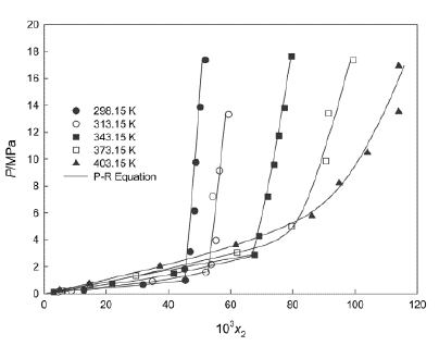 La solubilidad de los gases en líquidos se puede modelar utilizando la ecuación de PR, como es el caso de la solubilidad mutua del CO2 y el agua [27]. Investigaciones previas muestran la modificación del parámetro de interacción binaria (BIP) incluyendo una nueva función alfa, a la cual se determinó que la precisión para la presión de vapor del líquido es mayor [28,29]. La constante de Henry tiene el objetivo de determinar la solubilidad del propano en la fase acuosa, por ello, la ecuación de PR es implementada para caracterizaciones de la fase no acuosa en el sistema binario. La ecuación cubica de PR no es un modelo que se encuentra en función a , por lo cual, se puede determinar la solubilidad del componente por medio de modificaciones en sus parámetros de interacción binaria (BIP). Es importante aclarar que los datos de solubilidad entre propano (2) + NFM (1) y propano (2) + sulfolano (1) fueron correlacionados por PR sin modificación alguna en sus parámetros; sin embargo, si se realiza esta modificación a estos sistemas, se espera que la presión de vapor de NFM y sulfolano sea mayor en el rango completo de temperatura de 298,15 a 343,5 K.