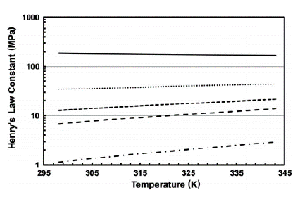 La solubilidad de un gas se modela a través de la ley de Henry. La constante de Henry denota cómo será el comportamiento de propano disuelto en cualquiera de estos disolventes a diferentes temperaturas. En efecto, esta constante indica en qué disolvente el gas se disolverá más rápido a temperatura constante. En este caso, el propano soluble en NFM o en sulfolano se somete a altas presiones. Según la investigación de Jou y Schmidt [5,6] la solubilidad del propano en NFM es más eficiente que la del sulfolano debido a que este primer solvente es más liviano en términos moleculares. Ambos estudios se realizaron a 298,15, 313,15 y 343,15 K con altas presiones, donde el comportamiento de la constante de Henry es evidente ante estas condiciones.
