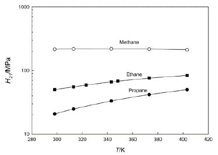En el caso de un gas como el propano, la presión será el factor clave cuando exista un sistema binario entre propano (2) + NFM (1) o el sistema propano (2) + sulfolano (1). Los estudios fisicoquímicos no solo son aplicables a la diversidad de hidrocarburos, sino a medicamentos como Eudragit [16], donde se evalúa un estudio fisicoquímico en base al pH de los solventes. Algunas investigaciones indican que los hidrocarburos tienen parámetros de solubilidad ajustados a la presión y temperatura [17]; tales parámetros son comunes para los hidrocarburos en estado líquido. Los parámetros de solubilidad se estudiaron teniendo en cuenta la temperatura crítica [18]. La temperatura crítica de los hidrocarburos, al igual que la presión de vapor, aumenta la constante de Henry a medida que aumenta la presión del sistema.