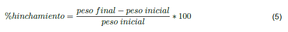 El espesor de las membranas se midió con un micrómetro analógico marca Mitutoyo Quantu Mike, haciendo mediciones en los extremos y el centro de la membrana, cubriendo así 5 puntos, y se reportó el valor promedio de los datos obtenidos. Para las pruebas de hinchamiento, solubilidad y respuesta al cambio de pH, se preparó una solución de fluido corporal simulado y se ajustó el pH a las condiciones necesarias. Se tomaron muestras de las membranas preparadas con dimensiones de 1 x 1 cm y cada ensayo se realizó por triplicado. La capacidad de hinchamiento de las membranas se determinó sumergiendo cada muestra en agua destilada y se fijó un intervalo de tiempo de 1 h. Transcurrido dicho tiempo se tomó el peso y área a cada una de las muestras, y se repitió el proceso hasta que el peso fue constante y en ese momento, se asumió que su capacidad de hinchamiento llegó al máximo, lo que permite calcular el porcentaje de hinchamiento a partir de la ecuación 5 [13].