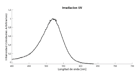 La solución de antocianinas fue caracterizada por espectroscopía de luz ultravioleta (UV), empleando un espectrómetro BioTek Synergy H1 Hybrid Multi-Mode Reader. El espectro fue tomado a la solución en un pH=1, debido a que en este pH se logran observar fácilmente las estructuras del catión flavilio responsable de la estabilidad de las antocianinas; para lo cual la solución tuvo que ser diluida en una relación de 1/20 v/v con agua destilada, con el fin de abarcar el rango espectral entregado por el equipo.