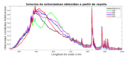 Los medios con diferentes valores de pH se prepararon mezclando soluciones de hidróxido de (2) sodio (NaOH) al 99 % y ácido clorhídrico (HCl) al 37 % en diferentes proporciones, y posteriormente 2 ml de la solución de antocianina obtenida fueron vertidos en cada uno de los medios preparados y se tomaron espectros de irradiancia absoluta a cada uno, con el objetivo de cuantificar los cambios presentes en las soluciones.