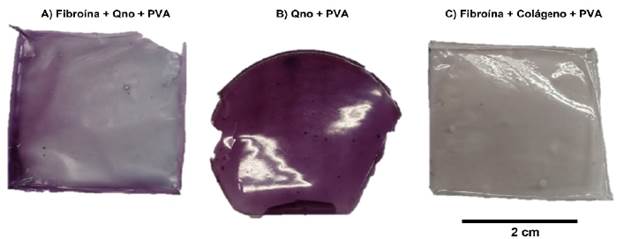 El polvo de colágeno se adicionó a la solución de PVA/antocianinas previamente obtenidas, y a dicha mezcla se le adicionó la solución de fibroína, manteniendo una relación de 70/30 fibroína-PVA/ antocianinas/colágeno, la cual se agitó por 30 min y luego se vació en una caja Petri y se llevó a secado en horno a una temperatura de 30 °C durante 48 h.