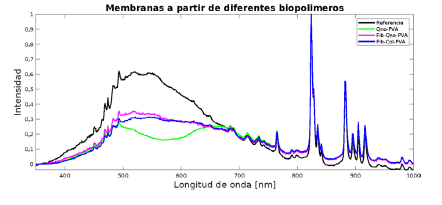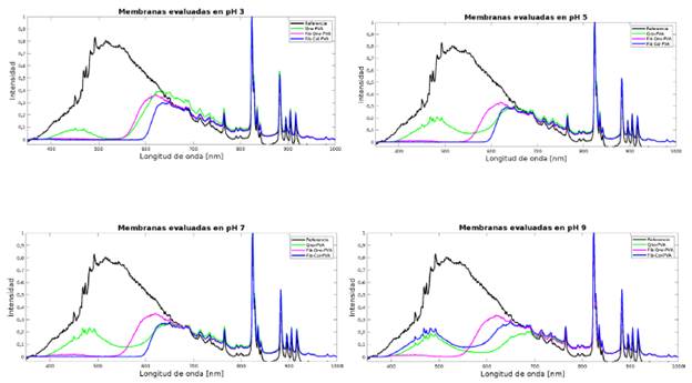 La muestra de fibroína-colágeno-PVA no presenta intensidad en la transmitancia en el rango de longitudes de onda para el color verde para pH de 3, 5 y 7, pero cambia significativamente cuando el pH llega a 9 (curva azul), resultado que puede ser atribuido al intenso color obtenido por esta membrana en este valor de pH, como se mostró en la Figura 5, razón por la cual, aunque existe dispersión por las fibras de fibroína es posible observar los picos de irradiancia esperados para este caso. El colágeno parece estar influyendo bastante en este comportamiento, pues para la membrana de fibroína y PVA sin colágeno, no presenta intensidad en la transmitancia en el rango de longitudes de onda del color verde. En tanto que la membrana de quitosano-fibroína PVA fue la que mejor se comportó ante todos los cambios de pH.