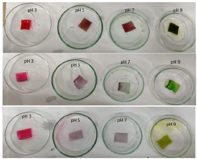 En las imágenes de las membranas sumergidas en los diferentes pH, se logra observar que hay un evidente cambio de coloración en todos los casos ocasionada por los valores de pH a los que fueron sometidas las membranas, sin embargo, se presentan diferencias de intensidad entre cada tipo de coloración, esto es debido a la cantidad de antocianinas presentes en ellas. Se hace evidente que todas las membranas fabricadas presentan cambios importantes de color al estar inmersas en medios de diferentes pH, esta característica es producida por la adición de antocianinas en la matriz de cada una de ellas. Como era de esperarse, mientras los pH se hacen más ácidos se presenta el proceso batocrómico que hace que las antocianinas muestren un corrimiento hacia el color rojo, mientras que para valores de pH básicos el proceso ocurrido es el hipsocrómico, dándose el corrimiento hacia el azul, acorde con lo reportado por Faraldos y colaboradores [15].