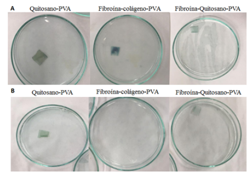 En la figura se puede observar que la muestra de fibroína-colágeno-PVA, es la que menos perdura en el tiempo, ya que luego de 3 h de exposición había perdido su estructura solubilizándose por completo, aunque esta es la membrana que más volumen absorbió y más tiempo demoró en llegar a su estado de máximo hinchamiento (según la Tabla 1), se puede concluir que esta no generó el grado de entrecruzamiento necesario para darle estabilidad en la solución fisiológica.