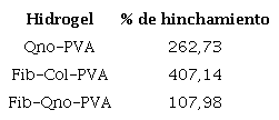 De la tabla se puede observar que la muestra que presentó mayor porcentaje de hinchamiento fue la compuesta de fibroína-colágeno-PVA, esto se debe a que el colágeno es altamente hidrofílico y se combina fácilmente con los enlaces de hidrógeno de las moléculas de agua para formar nuevos enlaces, además de esto, tiene la capacidad de formar poros de mayor tamaño en las membranas aumentando así su capacidad de absorción [16]. Mientras que la muestra de fibroína-quitosano-PVA obtuvo el menor porcentaje de hinchamiento debido a que es la que contiene menos cantidad de PVA, que es el agente que otorga la característica de macroporosidad en este tipo de compuestos poliméricos, por lo cual su capacidad absortiva se ve disminuida [17], además, también se podría atribuir a la disminución del entrecruzamiento del quitosano con el PVA por interacción de los enlaces de la fibroína, inhibiendo la capacidad de absorber agua.