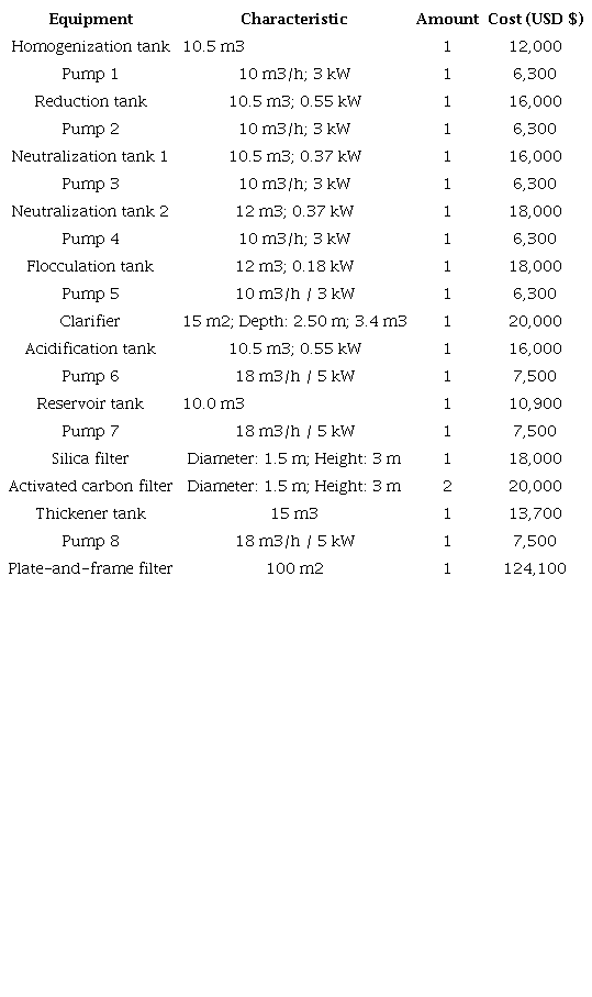 Table 4 shows the characteristics of the main equipment included in the wastewater treatment plant, as well as their acquisition costs, which were taken from various references [39-42] and updated to August 2021 using the corresponding cost index [43].