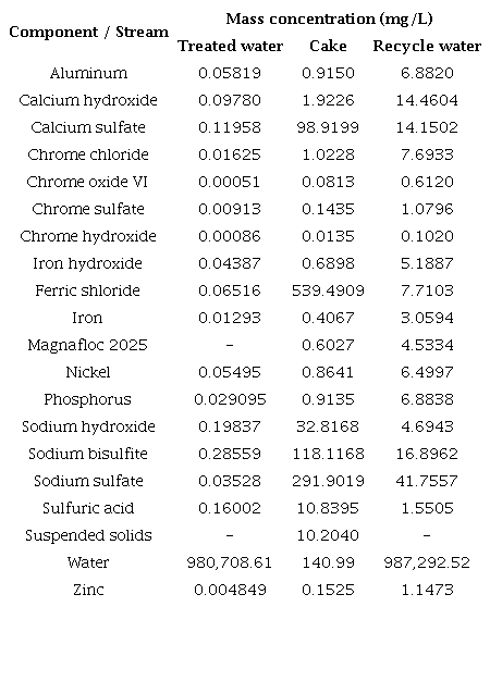 Table 5 expresses the mass concentration of the three main outflow streams from the wastewater treatment plant, that is, Treated Water, Cake and Recycle Water. It's worth to mention that 1,815.85 and 1,863.63 kg/batch of washing water are consumed in the silica Alter and activated carbon Alters, respectively, while 6,959.90 L/ batch; 1,051.53 kg/batch and 5,881.89 L/batch are obtained for treated water, cake and recycled water, respectively.