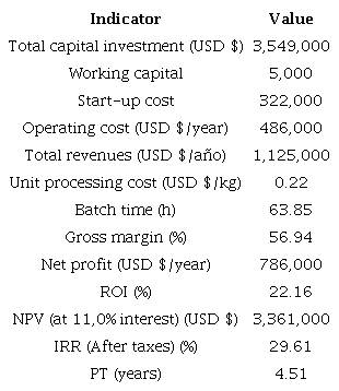 As can be seen in Table 7, the total direct cost of the plant amounted to USD $ 1.649 million, while the total indirect cost of the plant had a value of USD $ 1.153 million, to obtain a total cost of the plant of USD $ 2.802 million. Finally, the Direct Fixed Capital required by the project had a value of USD $ 3.222 million.
