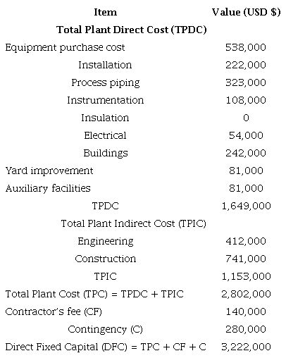 Table 7 describes the main items included during the estimation of the direct fixed capital of the proposed wastewater treatment plant.