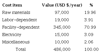 The facility-dependent costs were determined based on the capital investment parameters, thus selecting the maintenance (using specific multipliers of each equipment) and depreciation (using the contribution of the non-depreciated purchase cost of each equipment) options, a salary of USD $ 0.73/h and $ 0.95/h was set for operators and supervisors, respectively, while the cost related to quality assurance and control in the laboratory was considered as 15% of the total labor cost. Expenses for research and development activities were not taken into account, an electricity unit cost of USD $ 1.20/kW-h was considered, and that USD $ 10,000 per year is disbursed for process validation operations.