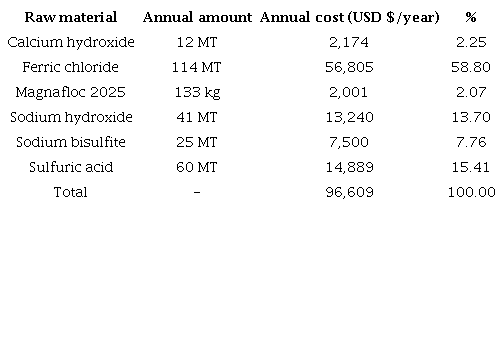 Analyzing the values in Table 9, it can be deduced that the reagent that most influences the annual costs for consumption of materials is ferric chloride, with USD $ 56,805/year (58.80% of the total), because it constitutes the reagent with the highest unit cost (USD $ 500/MT) and, in addition, is the reagent with the second highest consumption in the treatment process, with 114 MT. Sulfuric acid constitutes the reagent with the second greatest influence on this cost, with USD $ 14,889/year (15.41%), which is mainly due to the fact that it is the reagent with the third highest annual consumption, with 60 MT/year. Finally, the third reagent that most influences these costs is sodium hydroxide, with USD $ 13,240/year (13.70%), since it is the reagent with the fourth highest consumption (41 MT/year) and the second highest unit cost (USD $ 320/MT).