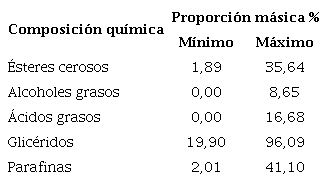 Diversos trabajos de investigación abordan la caracterización de las bioceras obtenidas tanto en su composición química, como en sus propiedades macroscópicas [15-17]. Esta caracterización resulta determinante puesto que las propiedades macroscópicas de las bioceras (como punto de fusión, acidez, grado de saponificación e índice de yodo) permiten identificar su grado de deterioro, su estabilidad, sus características físicas y el manejo apropiado para el desarrollo de nuevos productos cosméticos [18-20].