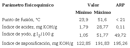 Solo 7 muestras de bioceras analizadas poseen valores de índice de yodo por debajo de lo establecido por la normativa NTC 1466 (10 g I2/100 g). Para índice de saponificación, solo una muestra presentó valores por debajo de lo establecido por la normativa NTC 1466 (130 mg KOH/ g). A pesar de que los valores de índice de yodo son mayores que los establecidos en la normativa, se observó que esas muestras poseen una cantidad de acilglicéridos y lípidos insaturados menores a los de la carga ARP y, por ende, se obtienen ceras con puntos de fusión mayores a los de la carga ARP.
