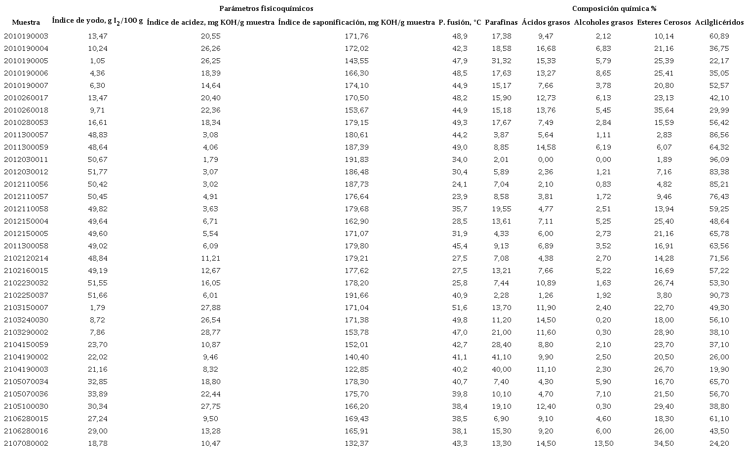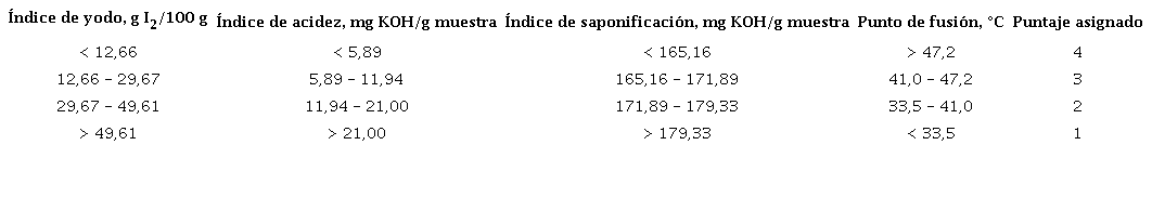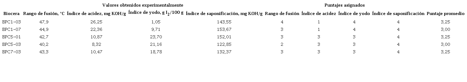 De las cinco muestras de bioceras con mayor puntaje asignado por el análisis estadístico descriptivo (Tabla 4), dos de ellas poseen índices de yodo menor a 10 g I2/100 g y cuatro de ellas poseen valores de índice de acidez menores que 25 mg KOH/g, lo que sugiere una mayor estabilidad o resistencia a la oxidación y degradación en el producto Anal, además de que facilitaría su uso en sistemas emulsionados.