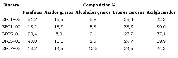 Se obtuvieron 34 muestras de bioceras por hidrotratamiento del ARP a diferentes condiciones de reacción. Estas muestras se analizaron por cromatografía de gases para obtener su composición química, agrupando la composición por familias como ésteres cerosos, alcoholes grasos, ácidos grasos, glicéridos y parafinas. Se pueden observar un resumen de los resultados obtenidos de la composición química de las bioceras en la Tabla 1 (En el anexo A se muestran todos los resultados obtenidos).