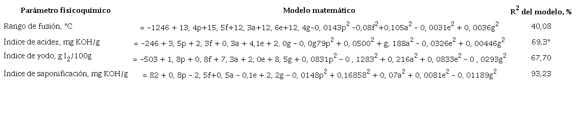 Seguidamente, cada parámetro fisicoquímico se ajustó a un modelo matemático que calcula y predice el valor usando la composición química de cada familia presente en las bioceras (Tabla 5). Se determinaron los modelos matemáticos y el porcentaje de correlación para los modelos de cada parámetro fisicoquímico: punto de fusión, índice de acidez, índice de saponificación e índice de yodo (Tabla 6).