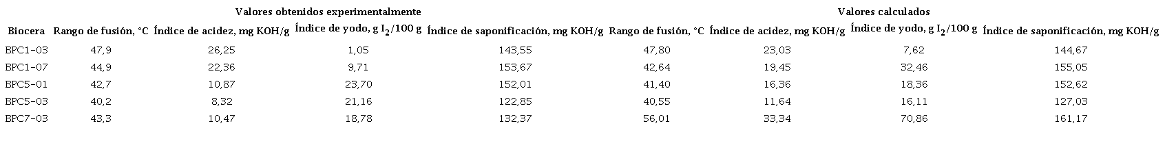 El parámetro de índice de yodo mostró un ajuste del 67,70 %, indicando también que algunas moléculas poseen grados de insaturación de diferente magnitud respecto a las estructuras químicas caracterizadas de manera general en familias. El punto de fusión tuvo el menor porcentaje de correlación en el modelo, de 40,08 %, debido a que sus resultados no siguen una concordancia con respecto a la cantidad de las familias de composición química de las bioceras. Cuando se comparan los valores experimentales con los predichos por los modelos ajustados en conjunto, se puede observar que, en 4 de las 5 muestras, los parámetros de punto de fusión e índice de saponificación poseen errores menores que 6 %. También se observó que los parámetros de índice de acidez y de yodo poseen un error muy alto asociado al modelo obtenido. Al utilizar una sola composición química para calcular todos los valores de los parámetros fisicoquímicos, se observó que los valores se ajustan mejor para los parámetros de punto de fusión e índice de saponificación y se perdió ajuste para los parámetros de índice de acidez y yodo e índice de saponificación.