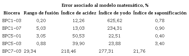 Se calcularon los valores fisicoquímicos a partir de la composición química de las cinco bioceras seleccionadas con el mayor puntaje establecido en el análisis estadístico descriptivo (Tabla 4) utilizando los modelos matemáticos. Al calcular el valor teórico de cada parámetro fisicoquímico en función de la composición química de una biocera en particular, esta misma composición se utiliza para determinar los demás parámetros de esa biocera. Seguidamente, se compararon los valores experimentales con los valores calculados (Tabla 7). También se determinó el error asociado de cada parámetro para cada biocera analizada (Tabla 8).