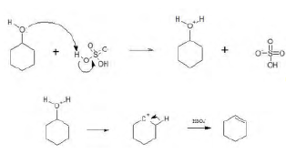 Quando um álcool é aquecido na presença de um ácido forte, ocorre a eliminação de água com formação de um alceno. Esta reação é conhecida como desidratação de álcoois. Quando tratados com ácidos, álcoois secundários e terciários geralmente eliminam água através de um mecanismo envolvendo a participação de um carbocátion como intermediário [2]. No caso da reação de um álcool primário como o ciclohexanol, tem-se a seguinte reação: