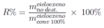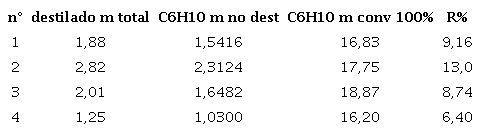 De acordo com os dados da Tabela 1 e a reação estequiométrica de desidratação pode-se calcular a massa de ciclohexeno obtida no destilado. A Tabela 2 contém os resultados em que o rendimento da reação (R%) é calculado pela Equação 2,