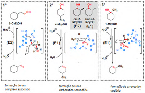 Hintermeier et al.[8] realizaram a desidratação de ciclohexanol, trans-2-metilciclohexanol, bem como isômeros cis e trans de 4-alquilciclohexanois que ocorreu predominantemente por meio de um caminho do tipo E1, enquanto a desidratação de cis-2-metilciclohexanol ocorreu principalmente por meio de um caminho do tipo E2. (Figura 1)