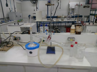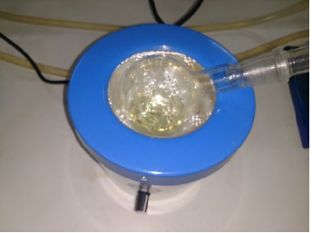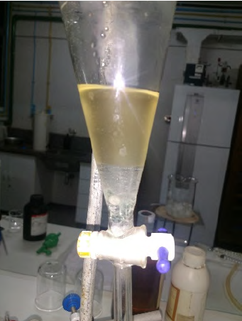 O frasco coletor de destilado, por precaução, deve ser mergulhado num banho de gelo para impedir perdas por evaporação. A água de resfriamento do condensador foi alimentada a 10 °C. A destilação é finalizada de acordo com o tempo que se deseja que deve ser menor que 60 min ou quando restar apenas um pouco de resíduo a ser destilado. Deixa-se que o sistema esfrie um pouco para iniciar a desmontagem. Em seguida, pesa-se o destilado e o transfere para um pequeno funil de separação, como pode ser visto na Figura 5. Pesa-se, também o resíduo reacional que ficou no balão de destilação.