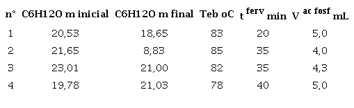 Na Tabela 1 pode-se conferir a massa de ciclohexanol usada inicialmente e remanescente ao final do experimento. O tempo de experimento (tferv ) em min, a temperatura de ebulição média (Teb ) em que se deu a reação e o volume de ácido fosfórico usado (Vac fosf ). A massa de destilado que continha o ciclohexeno foi calculada por diferença.