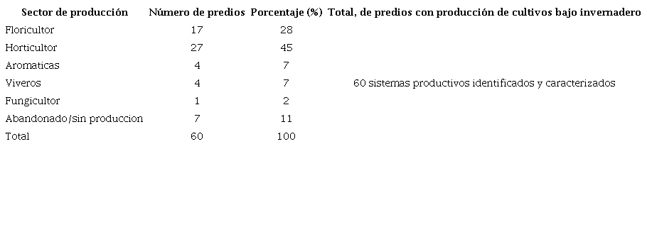 Resultados: Los principales resultados permitieron establecer que existen alrededor de 60 cultivos bajo invernadero de flores, hortalizas y plantas aromáticas en el municipio. Se registraron unas 361,62 hectáreas cultivadas en invernadero, que representan el 3 % de los suelos del municipio.