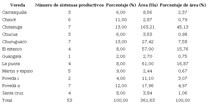 El inventario de predios para los 60 sistemas productivos identificados y para los que se hizo la caracterización, se pueden observar en la Tabla 1.