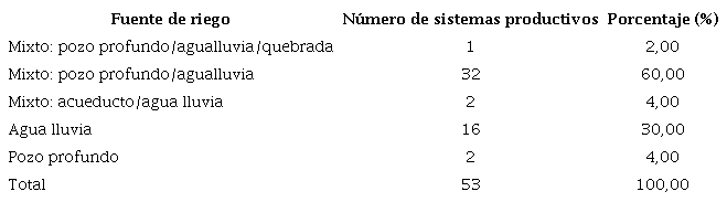 Impacto ambiental en la hidrosfera: Los resultados muestran que las fuentes de riego en estos cultivos, se alimentan principalmente por agua que proviene de pozos profundos y de recolectores de agua lluvia (60 % aproximadamente) (Tabla 6).
