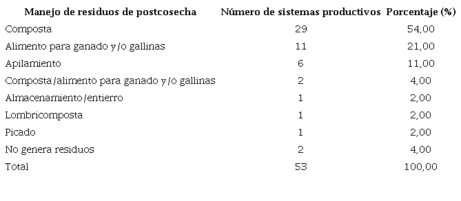 Impacto ambiental en la Biosfera, Atmosfera y Geosfera: Al analizar los resultados arrojados en cuanto al manejo de residuos postcosecha (todo material de origen vegetal biodegradable), se encontró que. el compostaje es una práctica arraigada en el municipio (54 %) (Tabla 7). Se podría decir que el manejo de estos residuos es adecuado en general y que las prácticas de picado, apilamiento, además del almacenamiento y entierro, se presentan como precursoras de sistemas potenciales de compostaje para el futuro.
