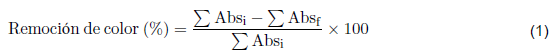 Los procesos de adsorción se llevaron a cabo con 200 mL del ARnD real cruda en matraces de 250 mL, con un agitador de baño isotérmico (Autoshaking LABWIT ZWY-100H) a 200 rpm durante 2 h a temperatura ambiente y pH igual a 3,65. Se realizaron pruebas preliminares para determinar el equilibrio de adsorción y se varió la cantidad de los adsorbentes entre 1- 5 mg. Adicional a la cuantificación de la concentración de los metales pesados antes y después de la adsorción, también se llevó a cabo un seguimiento de decoloración del ARnD usando un equipo GENESYS 10S UV-vis a partir de las lecturas de absorbancia en el rango de longitud de onda entre 270 - 800 nm. La eliminación del color en el ARnD se calculó utilizando la ecuación (1). Donde Absj y Absf son la absorbancia inicial y la absorbancia final a las 2 h, respectivamente.