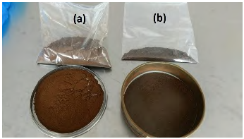 Se recolectaron pseudotallos de plantas de banano de la especie Crash Michael cosechados en un cultivo en el municipio de Girardota, Antioquia, se cortaron en rodajas y se secaron al sol durante 24 h eliminando parcialmente la humedad del material. Posteriormente, se secaron en un horno por convección a 100 °C durante 72 h para eliminar el agua restante. El material seco, se cortó en trozos de alrededor de 1 cm de longitud, se molió en un molino de cuchillas y Analmente se codificó como BPT. Para la obtención de la biomasa en polvo a partir de las cáscaras de banano de misma especie Crash Michael, se despulpó la fruta de desecho suministrada por la Asociación Gremial Asohofrucol ubicada en Itagüí, Colombia. Las cáscaras se lavaron con agua desionizada para remover impurezas, se trozaron con tamaños de aproximadamente 2 cm y se llevaron a secado durante 24 h a 80 °C en un horno por convección para Analmente molerse en un molino de cuchillas y codificarse como BCB. Ambos materiales, se tamizaron a través de una malla ASTM 80 con el fin de obtener la biomasa seca en polvo con un tamaño de partícula homogéneo (Figura 1). Además, durante todo el proceso se realizaron los pesajes correspondientes para calcular los rendimientos hacia la biomasa en polvo obtenida. El carbón activado comercial (CAC) tipo Darco 20 x 40 y producido por Norit (Norit Americas Inc.) fue seleccionado para las comparaciones de adsorción de los metales con los bioadsorbentes preparados en este estudio.