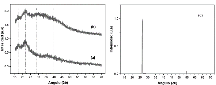 Los patrones de DRX de BCB y BPT mostrados en la Figura(2ay2b) reflejan el aspecto amorfo de los materiales debido a la hemicelulosa y la lignina de la cáscara y pseudotallo de banano [36]. Además, se identificó la presencia de picos cristalinos a 17,4°, 22,1°, 27,8° y 40° indicando la naturaleza cristalina del material celulósico los cuales concuerdan con los estudios realizados hacia este tipo de materiales [34,35]. Por su parte, en el difractograma del carbón activado comercial (Figura 2c) se detectaron dos picos en 28 igual a 26° y 54° los cuales son representativos para un carbón grafítico y comparables con lo reportado en la literatura [36].