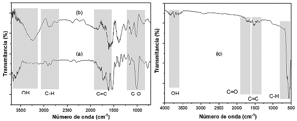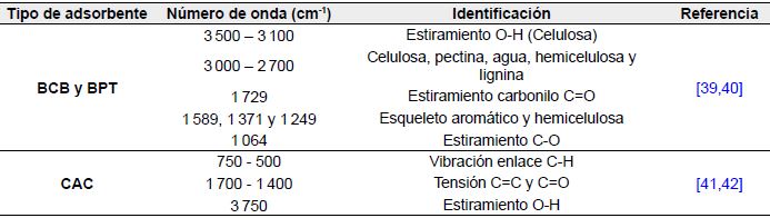 De acuerdo con los resultados obtenidos por el método de Boehm (Tabla 3) y DRIFT (Tabla 4 y Figura 3), los grupos funcionales predominantes en los materiales son O-H, C=O y C-O los cuales posiblemente están asociados a los grupos carboxílicos, lactónicos y fenólicos, y son los responsables de la adsorción de los metales principalmente por intercambio iónico y complejación. En cuanto a los grupos ácidos de la superficie de los materiales, no se identificaron grupos superficiales carboxílicos y lactónicos para los materiales CAC y BCB. Por su parte, BPT presenta valores de 47,0 mmol/g, 656,1 mmol/g y 163,7 mmol/g hacia carboxílicos, lactónicos y fenólicos, respectivamente. Como se puede verificar en la Tabla 3 la cantidad de grupos fenólicos es mayor para el material BCB (3 775,3 mmol/g), seguido del CAC (359,1 mmol/g) y por último BPT (163,7 mmol/g).