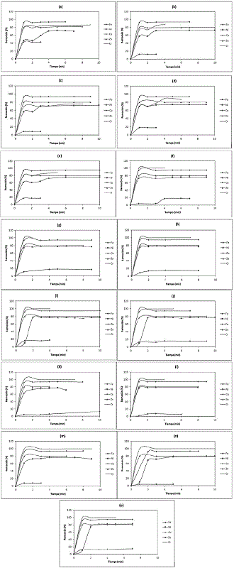 En las Figuras4a-4e,4f-4jy4k-4o se muestran los porcentajes de remoción para los metales con las diferentes cantidades de adsorbente en función del tiempo para los materiales BCB, BPT y CAC, respectivamente. En todas las figuras se observa que el equilibrio de adsorción se alcanzó en aproximadamente 3 min, permaneciendo constante a partir de este tiempo debido a la saturación superficial de los materiales. Los cortos tiempos de adsorción para alcanzar el equilibrio encontrados en el presente trabajo, concuerdan con los hallazgos reportados por Thokkanen y colaboradores, quienes encontraron tiempos de equilibrio a 15 min o menores en matrices con más de 2 analitos [44]. Esto se debe principalmente a los fenómenos de competencia que se pueden presentar entre los diferentes metales por sitios de adsorción de naturaleza similar.