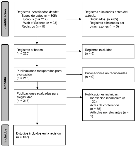 Este estudio se desarrolla mediante un análisis bibliométrico para evaluar y analizar la literatura pertinente de tecnologías convergente y la Industria 4.0 mediante la declaración PRISMA. Esta consiste en una lista de comprobación de 27 ítems y cuatro fases. El objetivo de esta declaración es que guiar a los investigadores en la realización de una adecuada revisión sistemática y metaanálisis [26]. El diagrama de flujo describe los criterios de identificación, selección, elegibilidad e inclusión de los documentos que se seleccionan en la revisión [27].