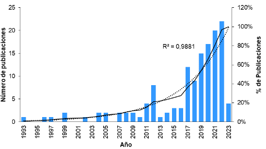 El análisis de los resultados se genera en referencia a los 137 artículos seleccionados en donde se aplican los indicadores de productividad, es decir, enfocado en la cantidad de publicaciones y el impacto, centrado en la cantidad de citas recibidas. Inicialmente, se realiza un análisis de las publicaciones por año, posteriormente los indicadores de productividad e impacto en función de los actores investigativos: autores, revistas y países. También, los resultados permiten vislumbrar un análisis de las tendencias temáticas a partir de las palabras claves más relevantes de cada año y la red de coocurrencia a partir del software VOSviewer. Así mismo, se presenta un análisis de la vigencia y frecuencia de las palabras claves y Analmente, se propone una agenda investigativa con las líneas de investigación futura. Inicialmente, la Figura 2 muestra el número de publicaciones anuales relacionadas a las tecnologías convergentes en la industria 4.0. Se observa la evolución del número de publicaciones desde el año 1993 (año en que se realizó la primera publicación), hasta la actualidad (año 2023), reflejando una tasa de crecimiento exponencial de alrededor del 98,81%. Además, se puede visualizar que en el año 2022 es el año con mayor interés sobre el tema de las tecnologías convergentes en la industria 4.0 registrando 22 publicaciones.