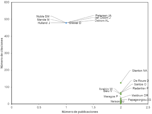 En la misma línea, el año 2021 ocupa el segundo lugar en cantidad de publicaciones, contando con un total de 20. Algunas de estos estudios investigan el funcionamiento de los equipos de innovación dentro de las organizaciones que se ocupan del desarrollo tecnológico digital, la forma de pensar del equipo y el proceso del equipo que retroalimentan de manera cíclica y reforzante [39]. En el caso de la Figura 3 se analizan varios aspectos, primero los autores con más citaciones sobre las tecnologías convergentes en la industria 4.0, segundo la calidad de publicaciones que difunden, y tercero los autores con mayor cantidad de publicaciones. Inicialmente los autores van Doorn J, Mende M, Noble SM, Hulland J, Ostrom AL, Grewal D, y Petersen JA, cuentan con el mayor número de citaciones asociadas a su única publicación la cual cuenta con alrededor de 479 citas registradas. En este artículo, se resalta la capacidad que tiene la tecnología para atraer nuevos clientes a las organizaciones, esto porque la tecnología ha avanzado tanto que se evalúan la presencia social automatizada lo que se define como la capacidad de las tecnologías para hacer que el cliente sienta la presencia de otro individuo, es decir, a futuro la tecnología se fusionará con la práctica del servicio al cliente y permitirá verdaderas relaciones entre robots de servicio y humanos [40].