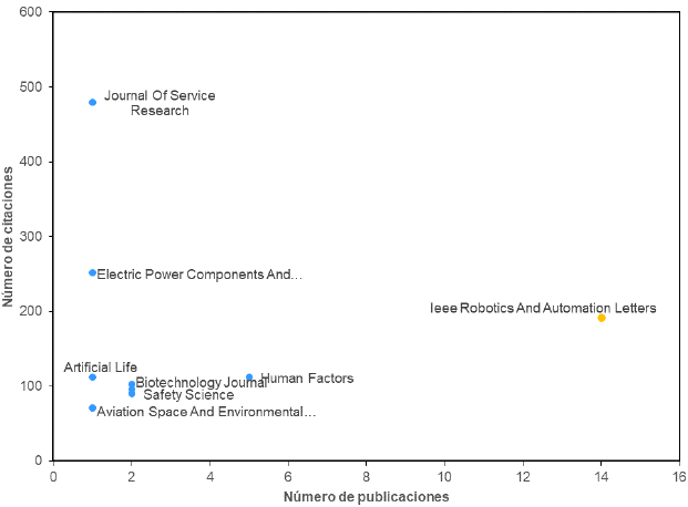 Como se puede observar en la Figura 4 se presentan las revistas que tienen un alto número de artículos y citaciones relacionadas. Adicionalmente, se visualizan las revistas que tienen un gran porcentaje de citaciones a pesar de sus pocas publicaciones y Analmente aquellas revistas con pocas citaciones, pero por la cantidad de publicaciones que tienen, se demuestra un gran interés en la temática de las tecnologías convergentes en la industria 4.0. En primer lugar, se ubica la revista Ieee Robotics And Automation Letters considerada la revista líder con un total de 192 citaciones relacionadas a sus 14 publicaciones sobre la temática. Estas, centradas principalmente en el uso de robots para el desarrollo de actividades tanto cotidianas como laborales, donde actualmente las cirugías complicadas que son asistidas por robots se realizan con mayor facilidad. Por esto, es importante desarrollar técnicas de segmentación para que las inteligencias artificiales reconozcan las diferentes actividades quirúrgicas, pues las cirugías involucran actividades continuas complejas que pueden contener acciones superfluas, repetidas y variaciones temporales [43]. En segundo lugar, aunque solo tiene una publicación relacionada a ella se encuentra la revista Journal Of Service Research la cual tiene 479 citaciones relacionadas. Dicho artículo presenta el cambio de la naturaleza del servicio a los clientes y las relaciones que los proveedores tiene con estos a causa de la evolución de la tecnología, donde se estima que a futuro el servicio se fusionara con la tecnología brindado numerosas experiencias nuevas a los clientes [40]. Electric Power Components And Systems es una revista que también se interesa por el tema de investigación de este estudio. A pesar de que cuenta con una sola publicación esta registra alrededor de 252 citaciones. En la publicación mencionada, se creó una estructura dinámica en tiempo real e interactiva que permitió diseñar y construir un sistema de energía del futuro, el surgimiento de las redes inteligentes fue un gran alivio para la industria de la energía eléctrica, debido a la diminución de la huella de carbono y el impacto ambiental que estaba generando [44].