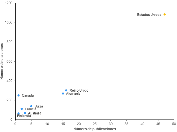 Por último, en la Figura 5 se clasifican los países con más publicaciones y citas relacionadas con las tecnologías convergentes en la industria 4.0, de igual forma estudia los países que tienen menos publicaciones, pero más citaciones, y finalmente examina los países con mayor interés en la temática, es decir, aquellos países con mayor número de publicaciones, pero con pocas citaciones registradas. Iniciando con Estado Unidos país que cuenta con 1083 citas, convirtiéndose así en un referente para otros países con sus 47 publicaciones. Una de las publicaciones más destacadas se enfoca en la automatización y cómo ha generado una dependencia a la hora de realizar tareas que son cada vez más complejas cognitivamente, es decir, que a la hora de realizar dichas tareas el ser humano se ha vuelto más dependiente cognitivamente de los equipos, se analizan los problemas relacionados con la interacción humano-automatización y las implicaciones que hay dentro del diseño de tecnologías de automatización, esto para mejorar el desempeño de las tareas en los equipos que se dedican a la automatización humana [45].
