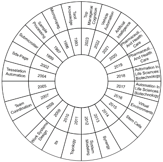 Los principales temas de investigación relacionados a las tecnólogas convergentes en la industria 4.0 sean desarrollado a lo largo de años. Las áreas de interés cambian cada año como muestra la Figura 6,micropropagation (micropropagación) fue el tema principal de publicación del año 1996, un tema enfoca en el estudio de la robotización del trasplante de protocormos en las orquídeas, reduciendo así los costos de mano de obra y a su vez evitando la contaminación biológica, con el sistema robótico desarrollado se podían realizar transferencia de protocormos con mayor eficiencia y precisión que los humanos [47].