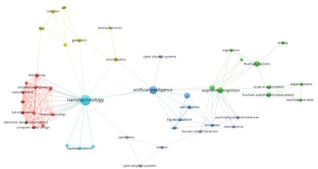 Para el análisis de la Figura 7, se han identificado 6 colores diferentes asociados con 6 redes temáticas distintas utilizando el software VOSviewer, conocidas comúnmente como clústeres temáticos de investigación. Esto permite discernir los diversos temas de interés relacionados con la investigación sobre las tecnologías convergentes en la industria 4.0. El clúster de color celeste está compuesto por palabras como nanotecnología y red bayesiana. En las últimas cuatro décadas, los dispositivos semiconductores de óxido metálico complementario han tenido un éxito considerable. Sin embargo, el aumento de fluctuaciones y ruidos intrínsecos ha generado la necesidad de diseñar automatización eléctrica que pueda predecir con gran precisión la confiabilidad de futuros diseños a escala nanométrica [51].