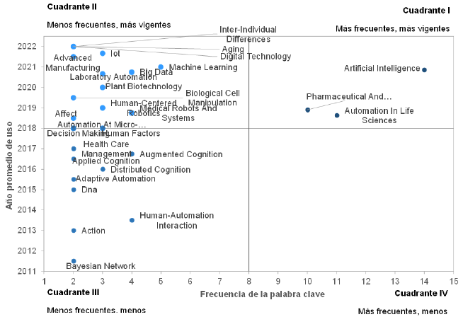 Finalmente, el primer cuadrante contiene palabras que asocian la frecuencia de uso con su uso reciente, y se consideran términos que orientan o incrementan la producción científica sobre las tecnologías convergentes en la industria 4.0. En este cuadrante se hallan los términos: artificial intelligence (inteligencia artificial), pharmaceutical and health care (farmacéutica y sanitaria) y automation in life sciences (automatización en ciencias de la vida). La sociedad ha encontrado más usos para la inteligencia artificial, generando así una relación humano-inteligencia artificial, la tecnología ha pasado de simplemente de codificar la información humana en máquinas, a el desarrollo de máquinas que saben cómo adquirir el conocimiento necesario autónomamente, además de aprender de él y operar de forma independiente en su entorno [55].